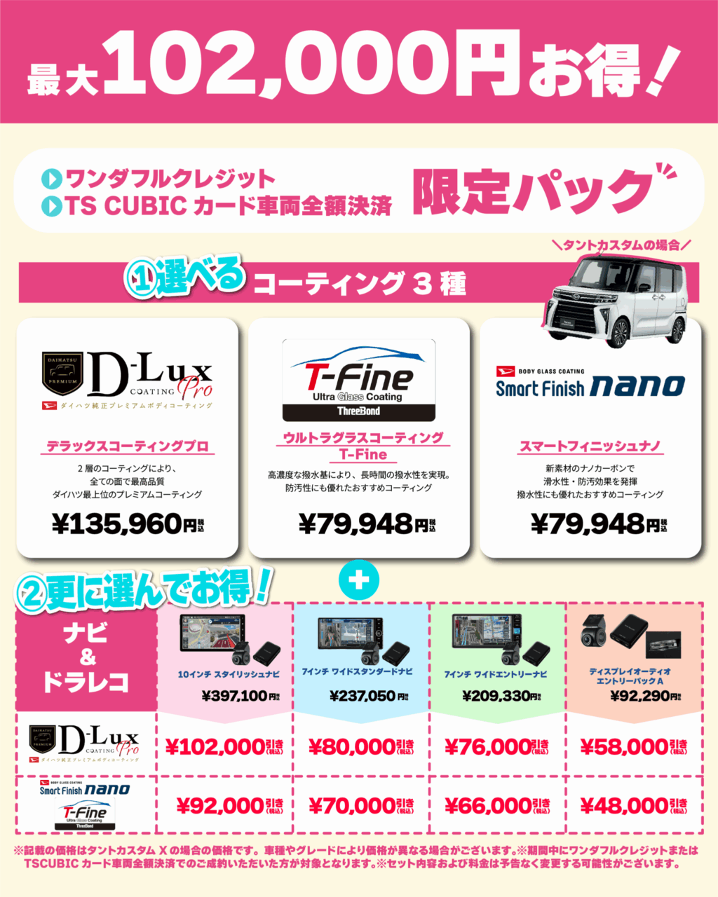 対象のお支払い方法をご利用いただくと、 人気のボディーコーティングと、ナビ&ドラレコがセットで… なんと最大102,000円(税込)もお得になっちゃうんです!😲🙌