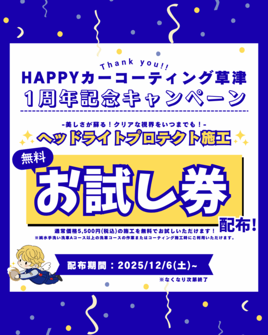 昨年草津店の隣にオープンした【HAPPYカーコーティング草津】が、2025年12月7日にOPENから1周年を迎えます!