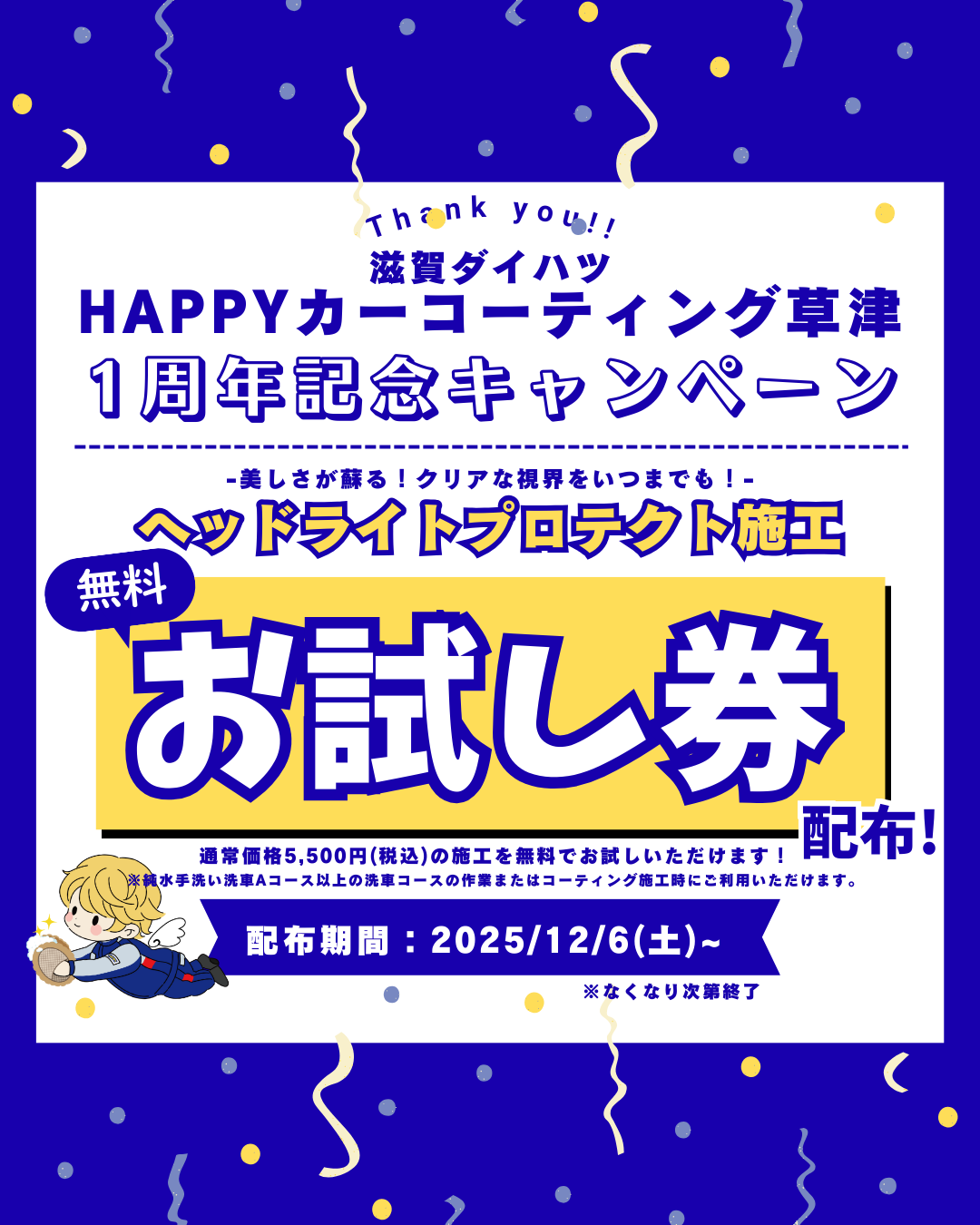 - お試し券のご利用をご希望される方は、必ず配布期間内(2025年12月6日〜)にHAPPYコーティング草津へお試し券をお受け取りにご来店ください。