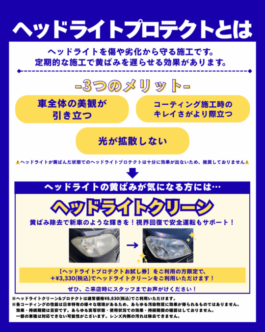 黄ばみが気になる方は+3,330円(税込)で【ヘッドライトクリーン】を【ヘッドライトプロテクトお試し券】と合わせて施工していただけます!