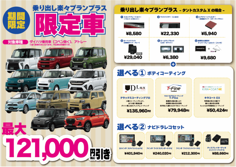 期間中、対象の新車をご成約いただいたお客様へ、人気用品の「乗り出し楽々プランプラス」と「選べるオプション」をセットにした「乗り出し楽々プラン プラス 限定車」を、最大¥121,000(税込)引きの特別価格でご提供します!