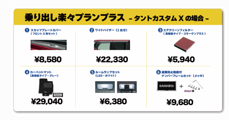 ※表示値引き価格¥121,000はタントカスタムX「乗り出し楽々プランプラス」+「デラックスコーティングプロ」+「10インチ スタイリッシュナビ&ドラレコセット」の場合の値引き価格になります。