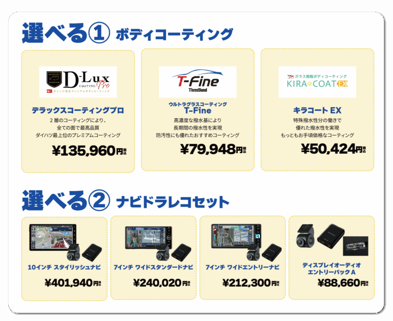 対象の新車のご成約時、「乗り出し楽々プランプラス」をお付けして、「選べるオプション」①と②からそれぞれ1つずつお好きな項目をお選びいただいた方限定で、最大¥121,000(消費税込み)お得に新車をご購入していただけます!