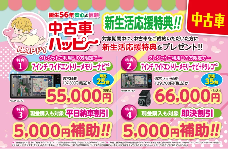 フェア期間中に、中古車をご成約いただいた方に、新生活応援特典をプレゼント!
