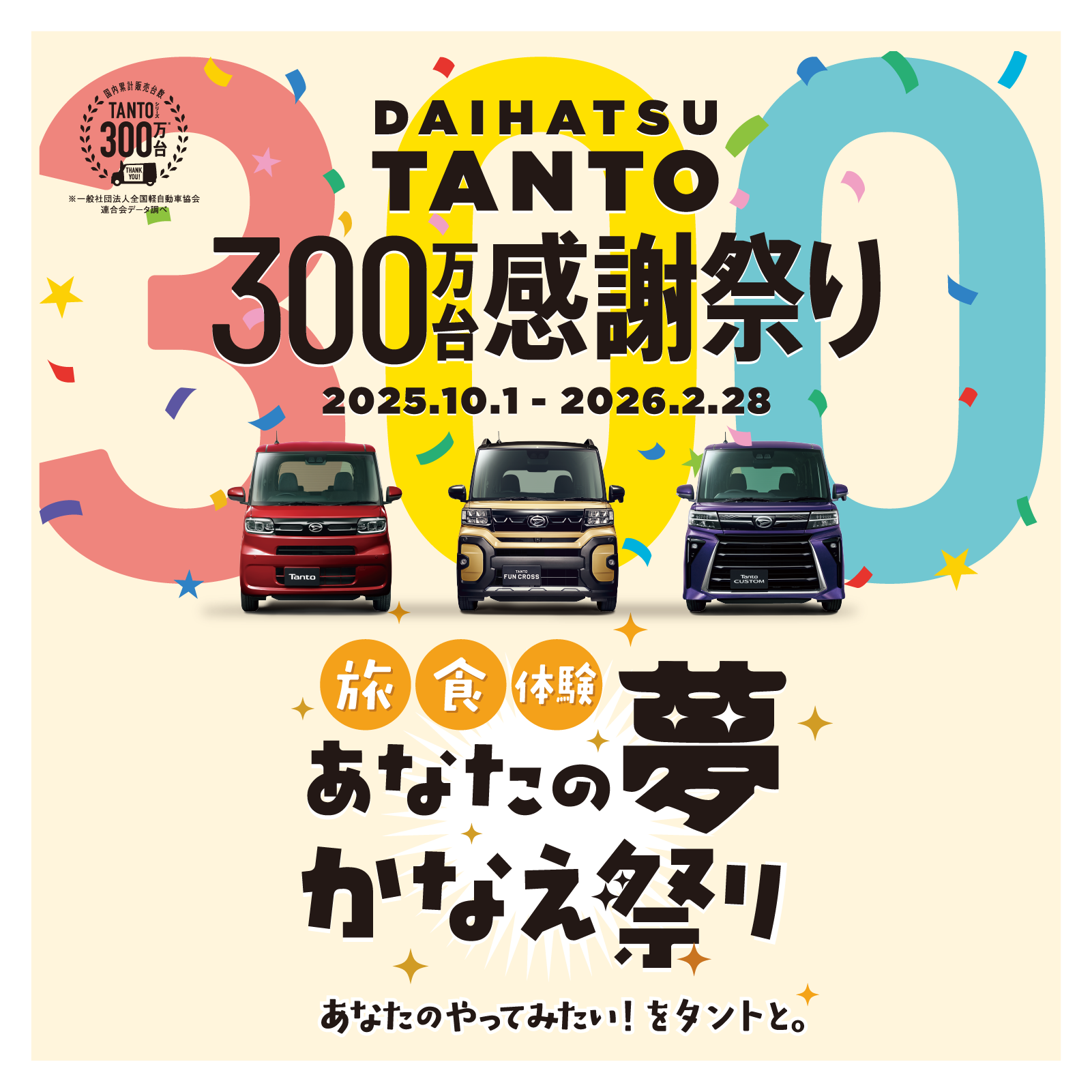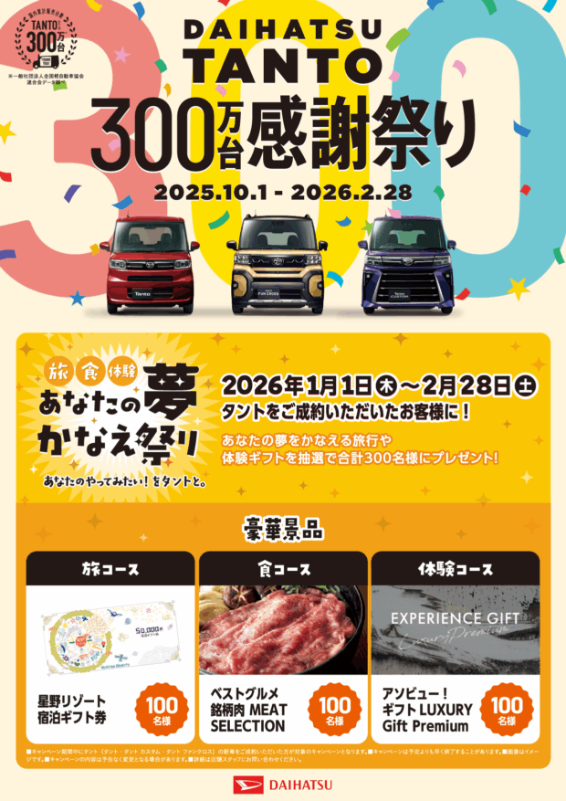 タント販売累計300万台達成を記念し、「旅食体験!あなたの夢かなえ祭り」を開催します!