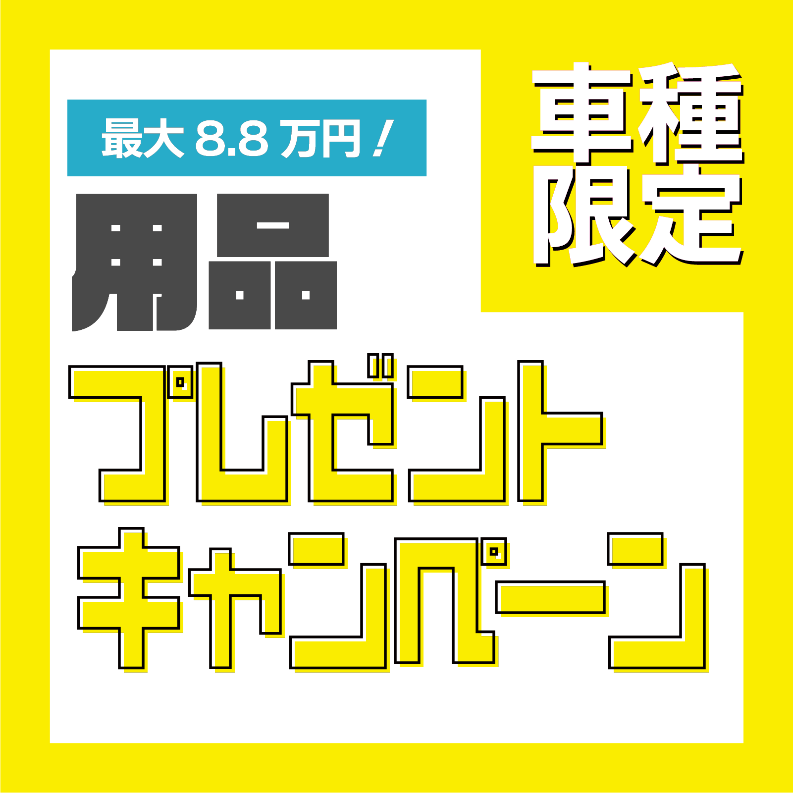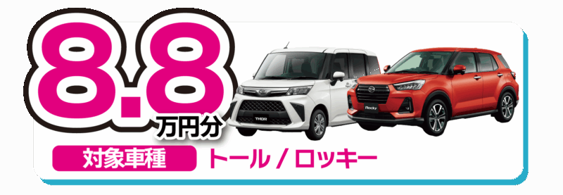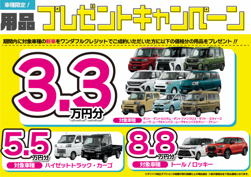 現在、対象車種の新車をご成約いただく際に、最大8.8万円!お得に用品をお付けいただけるキャンペーンを